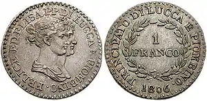 | FELICE ED ELISA PP DI LUCCA E PIOMBINO. Jugate busts of Elisa and Felice Pasquale Baccocchi | PRINCIPATO DI LUCCA E PIOMBINO. 1 FRANCO in two lines across field; all within wreath, 1806 in exergue. |