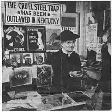 To pass the League's bill it would abolish trapping entirely but the legislators were unwilling to do this.[1] Furman received help from Vernon Bailey who had patented a humane animal trap. The trap known as a "Verbail trap" did not have steel jaws but a chain circle which contracted around the animal's foreleg.[1] Furman became a supporter of Bailey's humane trap and convinced the Animal Trap Company of America to manufacture the device.[1] The bill passed and took effect in 1940.[9] The Anti-Steel Trap League compromised on its early position and in the end did not oppose trapping or animal killing, it wanted it done humanely with the least amount of pain.[1]