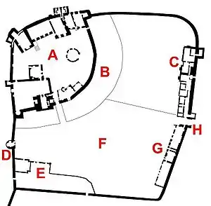 Plan of Ludlow Castle; locations: A – inner bailey; B – ditch; C – Castle House; D – Mortimer's Tower; E – St Peter's chapel; F – outer bailey; G – porter's lodge, prison and stable; H – entrance