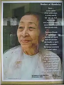 U Hla died in 1982 after 43 years of marriage, five children and six grandchildren. The Ludu couple had been one of the best known husband-and-wife teams among the Burmese literati. Daw Amar suffered another loss when her printing plants and warehouses burnt down in the great fire of 1984 that wiped out the heart of Mandalay.[1] Since she turned 70 in 1985, Daw Amar's birthday had been celebrated by the world of art and literature in Burma every year. The event had become an unofficial convention of dissidents under the watchful eyes of the ever-present Military Intelligence Service, normally taking place at Taung Laylone Monastery by the shores of Taungthaman Lake in Amarapura near Mandalay until November 2006 when the venue had to be changed under pressure from the authorities.[1][9][10] She remained active in public life and was instrumental in founding the Byamazo Luhmuyay Athin (Mutual Voluntary Aid Association) in 1998 engaged in helping poor families with the cost of healthcare and funeral arrangements.[1] She had been called 'Mother of the People' and 'Grand Old Lady'. In a society where old age is revered, most people would address her as Amei (Mother) the same as she would refer to herself according to Burmese custom.[1]