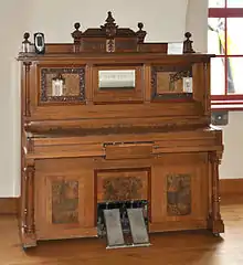 One of the most popular products since 1902 was the self-playing piano Phonola American, the European counterpart of the pianola. Hupfeld had some success with the 1908 reproducing piano DEA, which was later superseded by the more successful Triphonola. The mechanical violin Violina, an orchestrion, despite an ingenious design, was seen as aesthetically unsatisfactory and therefore less successful. Nevertheless by 1930 some 3500 had been built.[2] The instrument contained three violins which could be pressed against a circular bow by a bellows; just one string on each violin played, the note being determined by 'fingers' that were also controlled by bellows. The mechanism was controlled by punched paper rolls, in the same way as the piano section.