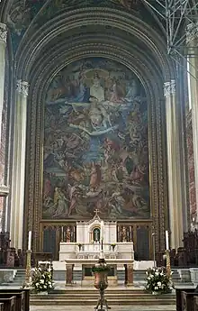 The frescoes of the church were created by Peter von Cornelius. They are perhaps one of the most important mural works of modern times. The large fresco of the Last Judgment (1836–1840), situated over the high altar, measures 62 ft in height by 38 ft in width. The frescoes of the Creator, the Nativity, and the Crucifixion are also on a large scale. But the work was rejected by the King, and Cornelius left Munich shortly afterward. The sculpture Four Evangelists with Jesus Christ was designed by Ludwig von Schwanthaler.