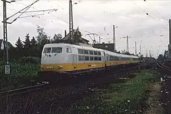 In 1981 the German airline Lufthansa wanted to lower the costs of the very expensive shorthaul flights between Düsseldorf Airport and Frankfurt am Main, and they came up with the idea of replacing these flights with rail transport.[3] The Deutsche Bundesbahn agreed and eliminated a problem of their own, that the Class 403 (1973) electric multiple units (EMUs) that were stored and not generating any revenue because they did not fit into the two-class InterCity system.[4] On 13 and 16 February 1981, the Class 403 made test runs as TEE Goethe on the West Rhine Railway.[5] The Class 403, consisting of three EMUs only, were refurbished and re-fitted with the same seats as the Lufthansa DC-10 business class and the grey-yellow Lufthansa livery on the outside.[3]