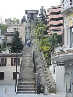 The Lugano degli Angioli funicular (Italian: Funicolare Lugano degli Angioli) was a funicular railway and inclined lift in the city of Lugano in the Swiss canton of Ticino. It linked a lower terminus near the lakeside and the church of Santa Maria degli Angioli with an upper terminus adjacent to the Hotel Bristol on the Via Clemente Maraini. The line remains in existence, although in an abandoned state and with no car. For most of its length, it is paralleled by the steps of the Salita degli Angioli.[1][2][3]