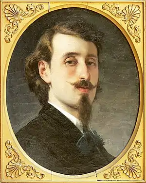 Among his historical canvases are: Confession of Isabella Orsini (1866); Torquato Tasso and Cardinal Cinzio Aldobrandini at the Convent of Sant'Onofrio, Rome (1867);[2] and The last moments of Niccolò de' Lapi.[3] Among his genre works are: Un'ora d'ozio in villa, Una debolezza femminile, Le gioie materne (1872), Il paggio e la duchessa, Compiacenze materne (1875), La visita alla puerpera, Le due madri (exhibited in Paris, 1878), Tutti hanno il loro nido , Il giorno onomastico di Bebé, La Parisina, and Conseguenze di un matrimonio celebrato col solo rito religioso (1875, Brera).[4][5]