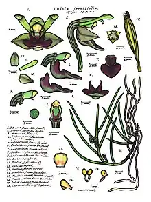 The velvet orchid was first formally described in 1786 by Georg Forster who gave it the name Epidendrum triste and published the description in Florulae Insularum Australium Prodromus.[5][6] In 1890 Joseph Dalton Hooker changed the name to Luisia tristis.[1] The specific epithet (tristis) is a Latin word meaning "sad".[7]