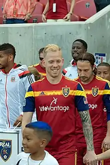 ![]() Mulholland lining up onto the field against DC United with Real Salt Lake in 2014. | |||