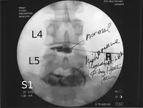 ![]() Lumbar provocative discography showing a degenerated disc, L5-S1 with normal disc L4-L5 | |