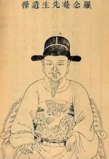 After passing the Imperial Examinations with the rank of jinshi in 1529, Luo worked as a senior compiler at the Hanlin Academy.[2] He was a student of the philosophies of the Neo-Confucian Wang Yangming.[1] Hearing of raids by wokou pirates on China's south-eastern shores, he began collating cartographical information for the Ming government, spending three years in research. During this period, he discovered the Yutu (Terrestrial Map), an atlas of China created by Zhu Siben during the Yuan dynasty some 300 years earlier around 1320,[3] which he adapted and expanded using Chinese measuring methods to create his Guang Yu Tu 廣與圖 (Enlarged territorial atlas), a work that covered the entire country. It was first published in 1561, and remained the principal reference work in Chinese cartography until the 17th century. The map included mountains, rivers, boundaries, roads, and other landmarks.[1][2][4] Luo's maps and geographical knowledge were put to use in the defense of the coast, and he was offered several government posts as a result but declined these offers.[2]
