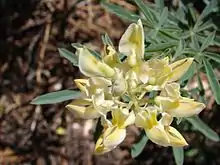 Lupinus angustiflorus is a species of lupine known by the common name narrowflower lupine. It is endemic to California, where it grows in the volcanic soils of the northeastern mountains and Modoc Plateau. It is an erect perennial herb sometimes exceeding one meter in height. Each palmate leaf is made up of 6 to 9 leaflets each up to 6 centimeters long. The inflorescence is up to 34 centimeters long, bearing many flowers each of which is roughly a centimeter long. The flower is cream to pale yellow-orange with a patch of deeper yellow or orange on its banner. The keeled lower petals may be tipped with lavender. The fruit is a hairy legume pod up to 4 centimeters long.