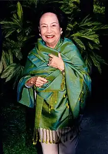 In 1930, she married Khun Binich Sampatisiri, who himself came from a prestigious background of public service. His father, Srisena Sampatisiri, served as ambassador to Japan and other countries in the 1930s and 1940s and was Thailand's Foreign Minister from 1944 to 1945, after which he served as Minister of Interior in the 14th Thai Cabinet.[5][6][7] Khun Binich, himself, served as the Chief of the Traditional Arts Division of the Department of Fine Arts at the Ministry of Education for The Royal Thai Government and was a frequent host to overseas visitors and celebrities, being known for his sense of hospitality and entertainment (US comic Joey Adams mentions his encounter with Khun Binich in his book On The Road for Uncle Sam).[8]