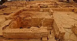 Lustral basins were common in elite buildings such as Minoan palaces and villas. Each palace had at least one lustral basin, with Phaistos having four of them.[3][4][5] At Knossos, one is adjacent to the throne room, while another is located near the north entrance.[7] Although they are commonly associated with palaces, lustral basins were common in other elite buildings. Known examples include the Villa of the Lilies at Amnisos, two houses at Tylissos, and several of the houses surrounding the palace of Knossos.[8]