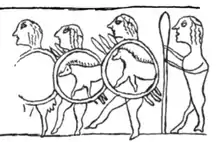 The claim that the event "extends back at least to the sixth century B.C." is based in part on a late 7th-century Etruscan wine-server (oinochoë) from Tragliatella (near Caere) which depicts mounted youths emerging from a labyrinth with the legend TRUIA, one possible meaning of which is Troy.[11] Vergil explicitly compares the patterns of the drill to the Cretan Labyrinth, which was associated with the geranos ("crane dance") taught by Theseus to the Athenian youth he rescued from the Minotaur there. In myth and ritual, the labyrinth, and hence the lusus, has been interpreted as "a return from danger, a triumph of life over death,"[12] or more specifically as an initiation ritual.[13] The geranos of Theseus serves as a "mythic prototype for the escape of initiates from the rigors of initiation"; the feet of the shield-bearers on the Truia wine-server may suggest dance steps.[14] Initiation iconography similar to that of the Etruscan oinochoë is found on a panel of the Gundestrup Cauldron, generally regarded as presenting Celtic subject matter with a Thracian influence in workmanship.[15] At least one of the Celtic polities of central Gaul, the Aedui, claimed like the Romans to be of Trojan descent and were formally recognized by the Roman senate as the "brothers" as well as the allies of Rome long before they were incorporated into the empire.[16]