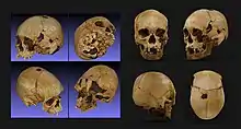 The fossil of Luzia was believed to have been destroyed when the National Museum burned, according to officials,[10][11][12] but firefighters later discovered a human skull within the burned museum.[4] On October 19, 2018 it was announced that the Luzia skull was indeed found, but in a fragmented state. 80% of the fragments were identified as being part of the frontal (forehead and nose), side, bones that are more resistant and the fragment of her femur that also belonged to the fossil and was stored. A part of the box that contained Luzia's skull was also recovered. The reassembly of the bones has not yet been undertaken.[13]