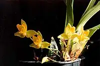 Lycaste cruenta has greenish yellow flowers with bright orange petals and labellum about 8 cm (3 in) wide. They appear in spring in the flower stems up to 15 cm (6 in) high, and there can be more than 20 flowers in one plant. They have a sweet scent resembling cinnamon in the evening. The leaves grow to 38 cm (15 in) long and 15 cm (6 in) wide and are shed before flowering. Lycaste cruenta has pseudobulbs up to 10 cm (4 in) long and 5 cm (2 in) wide.[1]