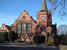 The main front of the building faces southeast. It has five bays in an irregular plan, and is mainly in one storey.[1] The walls are constructed in red Ruabon brick with blue brick diapering and stone dressings.[2][3] The roofs are of slate with tiled ridges. From the left, the first bay projects forwards. It has a three-light window, an elliptical-arched doorway and a plain gable. The second bay is recessed and higher, with three two-light windows and a shaped gable. The third bay is recessed even further, is in two storeys and has a doorway and a shaped gable. The fourth bay is the most substantial, wider and higher than the others, and projecting forwards. It contains three pairs of two-light windows and has a shaped gable in which there is a circular window with star-shaped tracery. There are finials on all the gables. On the right of the main front is a turret which has a square base and is octagonal above with broaches at the transition. On the ground floor is an elliptical-headed doorway with a two-light window over it. Above this is a string course, then a clock and a window on alternative faces. Over these is another string course and a parapet with ball finials. The turret is surmounted by a recessed slate spire with a weather vane.[1]