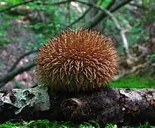 The fruit bodies of L. echinatum are 2–4 cm (0.8–1.6 in) wide by 2–3.5 cm (0.8–1.4 in) tall, and are roughly spherical, or pear-shaped.[21] The exterior surface is crowded with spines that may be up to 0.6 cm (0.2 in) long. According to Curtis Gates Lloyd, American specimens have more slender spines than European ones.[22] Initially white and becoming dark brown in maturity, the spines are often joined at the tips in groups of three or four.[23] In this form the puffballs resemble acorn caps of burr oak, with which they may readily be confused.[11] The spines slough off in age, revealing a somewhat net-like or reticulated surface. The fruit body has a small base that is an off-white or purple-gray color,[21] and it may be attached to the growing surface by thin white cords (rhizomorphs).[24] The internal contents of the puffball contain the gleba, a mass of spores and associated spore-producing cells. In young specimens the gleba is white and firm, but as the puffball ages, it turns yellowish and then brown to purple-brown and powdery.[13] Mature specimens develop a pore at the top of the fruit body through which spores are released when hit by falling raindrops.[24]