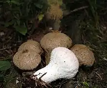 The disease was first described in the medical literature in 1967 by R.D. Strand and colleagues in the New England Journal of Medicine.[6] In 1976, a 4-year-old was reported developing the disease in Norway after purposely inhaling a large quantity of Lycoperdon spores to stop a nosebleed. Lycoperdon species are sometimes used in folk medicine in the belief that their spores have haemostatic properties.[7] A 1997 case report discussed several instances of teenagers inhaling the spores. In one severe case, the individual inhaled enough spores so as to be able to blow them out of his mouth. He underwent bronchoscopy and then had to be on life support before recovering in about four weeks. In another instance, a teenager spent 18 days in a coma, had portions of his lung removed, and suffered severe liver damage.[4] In Wisconsin, eight teenagers who inhaled spores at a party presented clinical symptoms such as cough, fever, shortness of breath, myalgia, and fatigue within a week. Five of the eight required hospitalization; of these, two required intubation to assist in breathing.[5] The disease is rare, possibly because of the large quantity of spores that need to be inhaled for clinical effects to occur.[4] Lycoperdonosis also occurs in dogs; in the few reported cases, the animals had been playing or digging in areas known to contain puffballs.[3][8][9] Known species of puffballs implicated in the etiology of the published cases include the widespread Lycoperdon perlatum (the "devil's snuff-box", L. gemmatum) and Calvatia gigantea, both of the family Lycoperdaceae.[6][8]