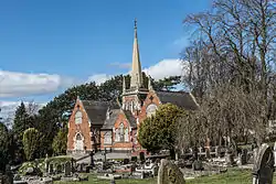 The Lye and Wollescote Cemetery Chapels building in the centre of the cemetery (originally called the Mortuary Chapels) was built in 1879 and is a Grade II listed building.[2][3] It had two chapels, at opposite ends of the building; the nonconformist chapel was closed in the 1970s and the Church of England chapel closed following a fire in 1993.[4] The West Midlands Historic Buildings Trust received a grant from the Heritage Lottery Fund to take full ownership of the building in March 2014. The trust planned to conserve the chapels and to bring them back into use as a venue for civil ceremonies.[5][6] This project also aimed to create resources to encourage people to discover more about their local heritage and nature conservation, in particular via a resource-pack for schools and a nature trail.[7] The refurbishment was completed in early 2016, the building is now in use as a secular registration office and has been renamed as the Thomas Robinson Building.[8][9]