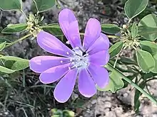 The Texas skeleton plant has a wide, light purple flower at the end of a thin and leafless stem, typically 12-24 inches in height. The base of the plant has a handful of small leaves. Only one flower blooms at the end of each stem at a time, and it features 8-12 light purple petals with a white center. The stems bleed sap when broken which can form into a gum.[2]