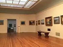 Each summer, large crowds would travel to the annual exhibitions, travelling by train to see the work at the library.[8] In 1903, Childe Hassam was the sole Impressionist among the tonalist exhibition, and his presence marked a turning point among the painters toward a more impressionist style.[9] In 1905, the Impressionist painter Willard Metcalf exhibited two works at the library.[10] Over the course of the twentieth century, artists such as Bruce Crane, Henry Rankin Poore, Robert Vonnoh, Bessie Potter Vonnoh, Matilda Browne, Charles Bittinger, Lawton S. Parker, Everett Warner, Ivan Olinsky, George Henry Bogert, Wilson Irvine, Edward Volkert, Carleton Wiggins, Guy C. Wiggins, Harry L. Hoffman, Edward F. Rook, Lydia Longacre, Clifford Grayson, Lawton S. Parker, Gertrude Nason, W. Langdon Kihn, Henry Kreis, Alphaeus P. Cole, Roger Dennis, Hugh DeHaven, Elisabeth Gordon Chandler, Jessie Hull Mayer, William S. Robinson, Frank Bicknell and Will Howe Foote would exhibit in the annual shows.[11][12][13][14][15]