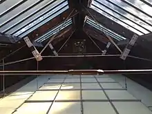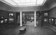 Inside, the walls were "dusky-blue"[40] with "a faint suggestion of gold".[41] The lighting from the skylights was considered perfect, with an even distribution of natural light on the walls.[42] This was made possible by a translucent ceiling of white muslin laylights below the skylights.[43] Inside the gallery, four large pillars stand, which can be removed to create one hall.[44]