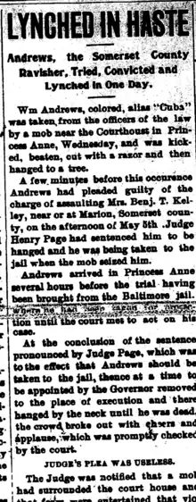 - ↑ "LYNCHING IN MARYLAND; William D. Andrews, a Negro, Beaten into Insensibility and Hanged at Princess Anne. JUDGE PAGE PLEADS IN VAIN Sheriff and His Deputy Overpowered While Taking the Man from the Courthouse to the Jail -- Second Attempt to Lynch Him". The New York Times. 1897-06-10. ISSN 0362-4331. Retrieved 2022-12-06.