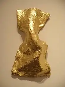 Benglis's work is noted for an unusual blend of organic imagery and confrontation with newer media incorporating influences such as Barnett Newman and Andy Warhol.[13] Her early work used materials such as beeswax before moving on to large polyurethane pieces in the 1970s and later to gold-leaf, zinc, and aluminum.[13] The validity of much of her work was questioned until the 1980s due to its use of sensuality and physicality.[14]