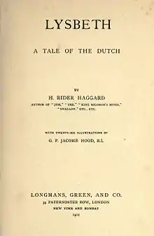 Lysbeth: A Tale of the Dutch is a 1901 novel by H. Rider Haggard.[1] Lysbeth is a historical novel set in the Netherlands during the time of William the Silent.[1]