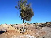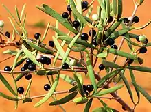 According to Les Hiddins, Aboriginal people would eat the fruit without chewing so they wouldn't stick to the tongue.[30] The ripeness of the berry is indicated not only by its softness, but often also by a slight translucence. When quite ripe the sticky, gelatinous, sweet pulp surrounding the single seed is pleasant to eat, but its great stickiness often make the seed almost impossible to spit out. Birds have the same difficulty and may sometimes be seen wiping their beaks free of seeds against the branch of a tree.[31] Jennifer Isaacs lists berries of L. exocarpi and L.spathulata as being eaten in the Central desert[32] Peter Latz notes that the calories obtained would be rather low. Aborigines often pluck whole branches from the tree and pick off the berries at their leisure. These berries are particularly favored by children. Although all Aboriginal groups have two or more names for mistletoes, it appears that they do not give separate names to each species. The Walpiri word for both L. murrayi and L. spathulata is pawurlirri.[33] The Antakirinja people around Coober Pedy call the berries of L. exocarpi Ngantja.[34] Reference to the fruit was first contained in a letter written by Governor Gawler during an ill-fated expedition in 1839 led by Charles Sturt. Gawler to his brother-in-law, Henry Cox, 20 December 1839: "The poor boy (Henry Bryan) accompanied me most cheerfully, he had been resting all day and did not appear to suffer from the subsequent exertion. He brought me the pulpy but bitter fruit of the mesembryantheumum and the little berries of the exocarpi - and ate plenty of them himself - he made many observations about our course, appearing to recollect its striking features well, and calculated our distances with much precision".[35]