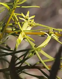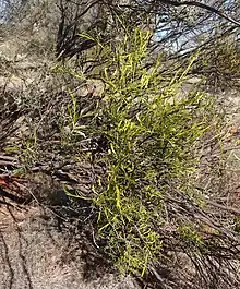 Lysiana murrayi (or Mulga mistletoe)[3] is an erect or spreading hemi-parasitic shrub in the Loranthaceae (a mistletoe family) which occurs in all mainland states of Australia except Victoria. It has flat narrow leaves (which may sometimes be semi-terete with a channel on the upper surface). The leaves are 2.5–6 cm long, 1–3.5 mm wide, do not have a distinct petiole, and the venation is not visible. The inflorescence is a solitary flower or pair of flowers without a common peduncle. The pedicels are 8–20 mm long, and strongly winged towards the apex. The spreading, membranous bracts are 2–3 mm long, and rounded at the apex. The corolla of the mature bud is usually 18–28 mm long, and white, yellow or pink. The fruit is globose, 7–12 mm long, and pink or red.[4]