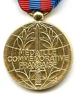 The French commemorative medal is a 30mm in diameter circular gilded medal struck from bronze. The obverse bears the effigy of the republic three quarters facing and wearing a Phrygian cap surrounded by the relief inscription along the medal circumference "RÉPUBLIQUE FRANÇAISE" (English: "FRENCH REPUBLIC"). The reverse is arranged akin a stylized globe, at the center, the relief image of a vertical sword pointing up within an olive wreath, the inscription "MÉDAILLE COMMÉMORATIVE FRANÇAISE" (English: "FRENCH COMMEMORATIVE MEDAL") superimposed over it in relief.[2]