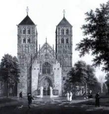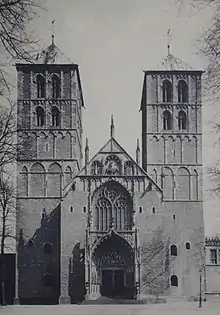 The cathedral had two predecessors. The first cathedral (called the Ludgerus Dom, 805–1377) stood to the north of the current cathedral; the second cathedral was built in the tenth or eleventh century and was demolished during the construction of the third and current cathedral between 1225 and 1264. The imposing westwerk with its nearly identical towers was built as part of the second cathedral around 1192 and was incorporated into the current building. As a result, the cathedral is a mixture of styles, combining the Romanesque westwerk, old choir, and west towers with the Gothic nave, transepts, high choir and ring of chapels.