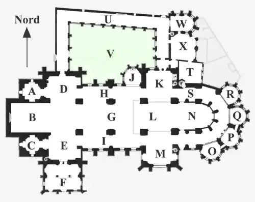 In 1390, the Marienkapelle (W), Annenkapelle (Y) and Elisabethkapelle (Z) were built – the latter two were incorporated into the new sacristry in 1885. Between 1390 and 1395, the cloisters (U) were built. In the process, part of the Alte Dom built shortly beforehand must have been demolished and moved to the west. Thereafter the Alte Dom was flanked by the west transept and the western end of the cloisters until its demolition in 1875.