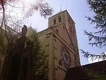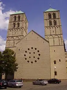 The diocese of Münster assumed that the second cathedral was built in the second half of the eleventh century, in response to a fire in the first cathedral which apparently occurred in 1071. The Überwasserkirche only a few hundred metres away was similarly burnt down in the same fire. According to the diocese, the second cathedral was built between 1071 and 1090.[3] The information of the diocese does not necessarily contradict Geisberg's conclusion since the diocese's claim is based on documentary information for the consecration of the second cathedral in 1090, which could have also occurred after a rebuild resulting from the fire.