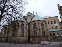 In 1377 the first cathedral was demolished and the so-called Alte Dom or Old Cathedral (e) was built, as a replacement for the first cathedral, which had been used as a choir by the chapter of the Old (Ludgerus) cathedral. Like the modern cathedral, the Alte Dom was built in the gothic style.