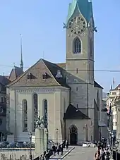 The equestrian monument in front of the Fraumünster church at Münsterbrücke was created by Hermann Haller. It was unveiled on 6 April 1937 by the Kämbel guild, aiming to rehabilitate Hans Waldmann, mayor of Zürich from 1482 to 1489 and their former dean, who they proposed had been the victim of a judicial murder.[3] The equestrian statue became the subject of controversy for artistic, political and historical reasons.
