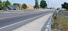 The Grayling Bridge is a 40-foot-long (12 m), 52-foot-wide (16 m)[1] rigid-frame steel stringer structure, with the superstructure securely connected to the abutments using of the arched brackets.[3] Nine rolled I-beams carrying the concrete roadway and sidewalks to each side. Ornamental steel guardrails, now supplemented with Armco guardrails, line the exterior.