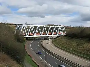 The upgrade plans were set into three discrete phases.[12] Phase one involved the creation of 8 kilometres (5.0 mi) of road from Stepps, routing north of Muirhead, Moodiesburn and Chryston, and meeting the line of the existing A80 at Mollinsburn with the construction of a new interchange, connecting the M80 with the M73 and the western section of the A80. Phase two required the online upgrade of the A80 between Mollinsburn and Auchenkilns, with the attendant upgrade of adjoining on-slip and off-slip roads, meeting the Auchenkilns Interchange. The interchange was opened in November 2005 after the online grade separation of the Auchenkilns Roundabout from the line of the dual carriageway created a grade separated dumbbell interchange, linking the A80 (and subsequently the M80) with the A73 and B8048.[13][14] Phase three saw the A80 upgraded online from Auchenkilns to the Haggs Interchange east of Cumbernauld – also seeing some junctions being upgraded, but with some being removed –[15] completing the connection of the western M80 to the eastern M80, and connecting to the M876 and M9 motorways. The M80 crosses the Glasgow to Edinburgh via Falkirk railway line and Forth and Clyde Canal.