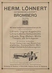 At the end of the 19th century, Löhnert's factory employed 240 workers, all were covered by a social security system and regularly received firm savings from the owner.[3] In 1899, the firm became a Joint-stock company with the participation of the Ostbank für Handel und Gewerbe (English: East bank for trade and commerce) from Poznań and changed its name to Bromberger Maschinenfabrik H. Löhnert AG, Bromberg (English: Bydgoszcz machine factory H. Löhnert AG). Hermann Löhnert was the chairman of the management board. The "Maschinenfabrik H. Löhnert" was exporting to Italy, Austria, Switzerland, United Kingdom, the Russian Empire and even to China or South America. This was the first factory in the history of the city present on several continents.[5]