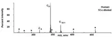 In areas with expanded newborn screening using tandem mass spectrometry (MS/MS), MCADD is usually detected shortly after birth, by the analysis of blood spots collected on filter paper. Acylcarnitine profiles with MS/MS will show a very characteristic pattern of elevated hexanoylcarnitine (C6), octanoylcarnitine (C8), decanoylcarnitine (C10) or decenoylcarnitine (C10:1), with C8 being greater than C6 and C10. Secondary carnitine deficiency is sometimes seen with MCADD, and in these cases, acylcarnitine profiles may not be informative.[3] Urine organic acid analysis by gas chromatography-mass spectrometry (GC-MS) will show a pattern of dicarboxylic aciduria with low levels of ketones. Traces of acylglycine species may also be detected. Asymptomatic individuals may have normal biochemical lab results. For these individuals, targeted analysis of acylglycine species by GC-MS, specifically hexanoylglycine and suberylglycine can be diagnostic.[3][5] After biochemical suspicion of MCADD, molecular genetic analysis of ACADM can be used to confirm the diagnosis.[6] The analysis of MCAD activity in cultured fibroblasts can also be used for diagnosis.[3]