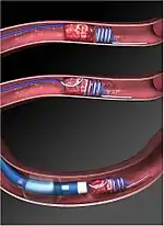 The retriever consists of a long thin wire with a helical coil formed at the distal end. A balloon catheter is snaked into the affected vessel from the femoral artery, and the balloon is inflated to prevent blood flow that could hinder the retrieval process. The retriever is then fed through the catheter, during which the distal coil is straightened to fit through the catheter tube. When the retriever emerges at the clot site, the coil reforms, wrapping around the clot and allowing the clot to be removed with the catheter.[3]