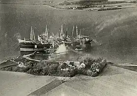 Here she remained until the end of the War, despite an allied air raid on 3 May 1945. During the attack the Java was sunk, while Falstria suffered some flooding and a fire. Jutlandia got off with some bullet holes and a minor fire in a cargo hold.