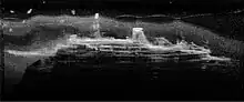 MS Mikhail Lermontov rests where it sank, lying on its starboard side in depths reaching up to a maximum of about 38 metres (125 ft). It is popular with scuba divers and the site is served by local dive shops in Picton and Kaikōura.[7] It is also one of the biggest, easily accessible, diveable ship wrecks in the world.[8] The dives range from an easy 12 metres (39 ft) depth at the top of the wreck, through to deep penetration and decompression dives to depths of 36 metres (118 ft). It is possible to enter the wreck, especially in the open public areas accessible from the port side windows near the top of the wreck, although care must be taken and guides familiar with the wreck are highly recommended, especially for enclosed overhead environments and where entanglement hazards may exist. Closed circuit diving is recommended to avoid causing reduced visibility when entering enclosed areas such as restaurants, crew messes, and shopping arcades. Three divers are known to have died while exploring the ship, including one diver whose body is still possibly trapped inside.[9]