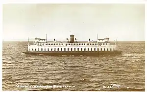 Originally built as the MV Redwood Empire in Oakland for Northwestern Pacific, she started out serving Southern Pacific Railways on their Golden Gate Ferries line on San Francisco Bay. She was purchased by the Puget Sound Navigation Company (PSN) in 1940, brought to Puget Sound and renamed the MV Quinault, serving PSN until Washington State Ferries acquired and took over operations in 1951.[2] In 2002, Quinault was featured in a scene in the movie The Ring.