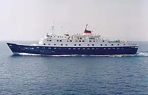 Bremerhaven was launched on April 2, 1960 for Bremen-Helgoland ferry route under the ownership of Argo Reederei. In 1965 Bremerhaven partially sank in shallow waters, subsequently being raised and made seaworthy. However, her original owners placed her on the market, selling her to the Sun Lines in 1965. Sun Lines had the newly renamed Stella Maris II heavily rebuilt, changing her superstructure practically entirely and replacing her tall, slim funnel that was placed amidships with a wider, shorter funnel placed aft. Throughout her long career with Sun Lines Stella Maris II served in the Mediterranean, Caribbean and Amazon. In 1996 Sun Lines merged with the Epirotiki.[2] After more than 30 years of service with Sun Lines Stella Maris II was sold to Viking Cruises in 1998. Under this new ownership she became the Viking Bordeaux. She operated under this name until 2004 when she was laid up. During her lay up in the Netherlands the ship was renamed Bordeaux. Shortly thereafter the ship was purchased by Indian Ocean Cruises, who expensively refitted and renamed her the Madagascar. After a very short amount of cruises from Durban this new venture failed as she was not fit for the rough waters of the area.[3] Madagascar was docked in Durban uneventfully for three years. She was then purchased to become the Razzmatazz of Razzmatazz Ocean Cruises.[4] This venture fell through, and the ship was towed to scrapyards at Alang in India and broken up in August 2008.