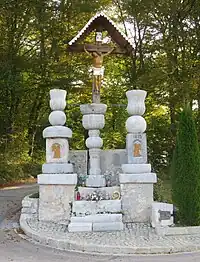 The Naral Shrine (Slovene: Naralovo znamenje), also known as the Naral Cross (Slovene: Naralov križ), stands west of Mačkin Hrib.[1] It was created in the nineteenth century by the local stonecutter Jože Novak after he returned from his military service. The wayside shrine is composed of a wooden cross on a stone plinth with a cast-iron support (from the Auersperg iron foundry in Dvor) and three columns with cup-shaped carvings at the top. The years 1875, 1884, and 1896 are carved into the stone.[9]