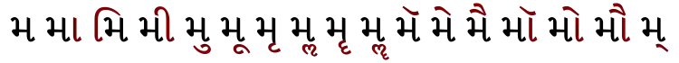 | म | मा | मि | मी | मु | मू | मृ | मॄ | मॢ | मॣ | मे | मै | मो | मौ | म् |