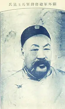 In 1874, Ma Yukun and Zuo Zongtang's department jointly fought against the aggression of Agubo and the Russian Empire in the Qing reconquest of Xinjiang, and then led the army to garrison the northwest for more than 10 years.[2][1][3] During the Guangxu period, he was transferred to Zhili. In 1894, he was awarded the commander-in-chief of Taiyuan Town, Shanxi, to assist Song Qing in garrisoning the Beiyang Naval Base in Lushunkou before the First Sino-Japanese War broke out.[2][3]