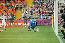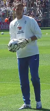 After Van der Sar's retirement from the national team, Stekelenburg became the Netherlands' first-choice goalkeeper under manager Bert van Marwijk. Stekelenburg was included in the preliminary squad for the 2010 FIFA World Cup in South Africa.[32] On 27 May 2010, Van Marwijk announced he would be part of the final 23-man squad participating in the competition.[33] Stekelenburg helped the Netherlands reach the final of the competition against Spain by making key saves throughout the tournament, most notably from Kaká in the Netherlands' 2–1 victory against Brazil in the quarter-finals.[34] He conceded six goals in the whole tournament, two of them being penalty kicks. Despite making a number of saves in the final, he ended up on the losing side, conceding the match's only goal to Andrés Iniesta in the 116th minute.